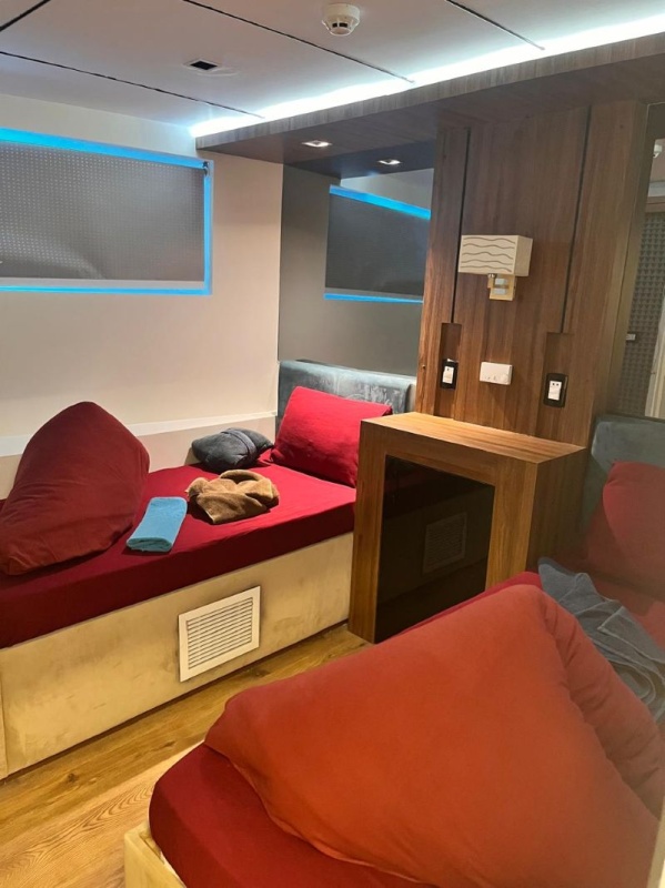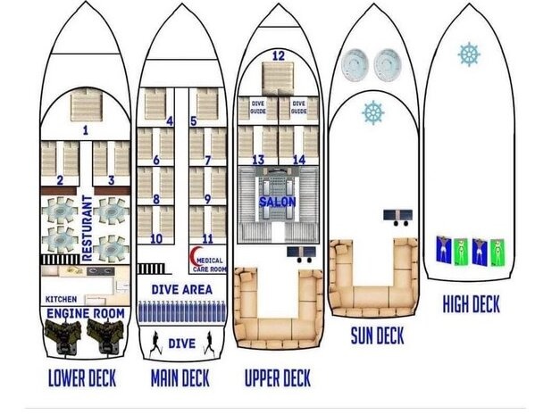 Das Boot verfügt über insgesamt 14 komfortable, klimatisierte Doppelkabinen, die Platz für bis zu 28 Taucher bieten. Jede Kabine ist mit einem eigenen Badezimmer, einer individuell regulierbaren Klimaanlage, TV sowie einer Minibar ausgestattet. Drei Kabinen befinden sich auf dem Unterdeck, eine davon ist mit einem Doppelbett eingerichtet. Auf dem Hauptdeck liegen weitere acht Kabinen, darunter zwei mit Doppelbett. Ergänzt wird das Angebot durch drei zusätzliche Doppelkabinen auf dem Oberdeck, von denen ebenfalls eine über ein Doppelbett verfügt.