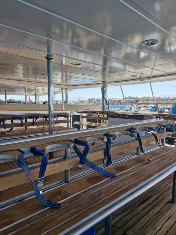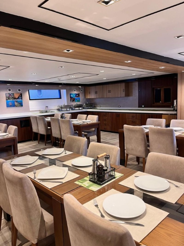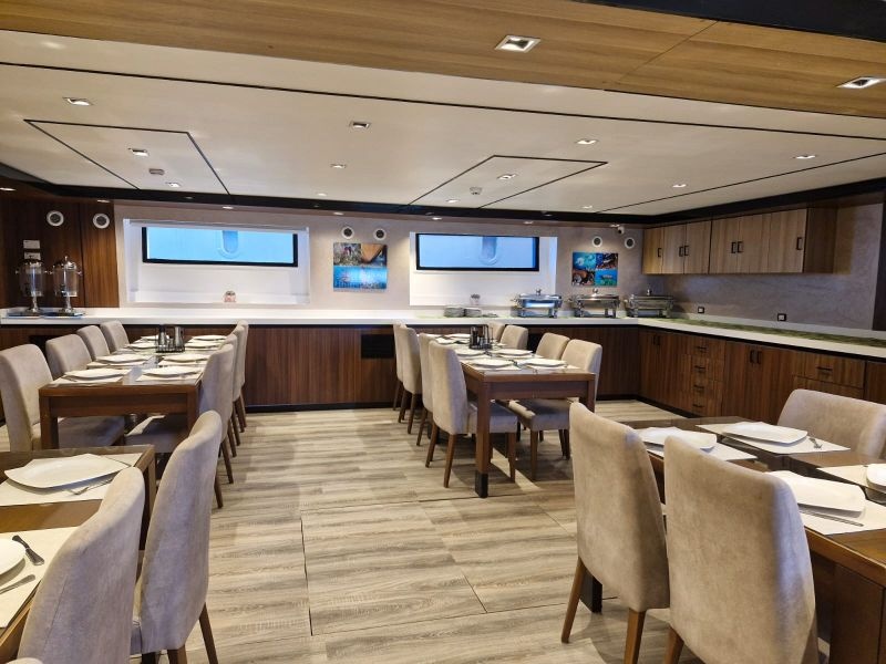 Der separate, klimatisierte Essbereich auf dem Unterdeck bietet ausreichend Platz für alle Gäste. Täglich werden drei Mahlzeiten in Buffetform serviert. Die Küche verwöhnt die Gäste mit einer abwechslungsreichen Auswahl an überwiegend europäischen und arabischen Spezialitäten. Für Kaffeeliebhaber steht zudem eine Nespresso-Kaffeemaschine zur Verfügung – bitte bringen Sie hierfür Ihre eigenen Kapseln mit.