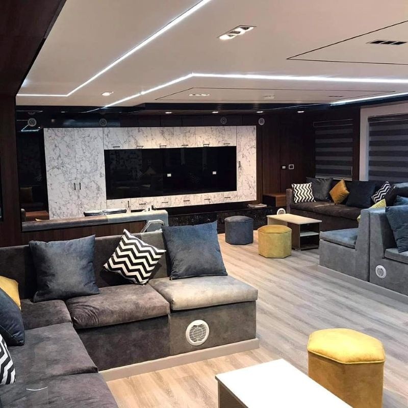 Der großzügige, klimatisierte Salon lädt zum Entspannen ein und verfügt über eine gemütliche TV-Ecke mit Fernseher und Soundsystem.