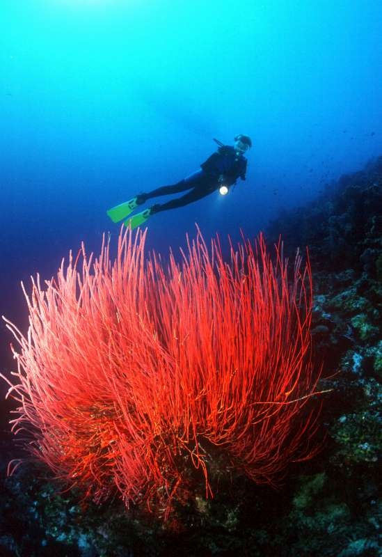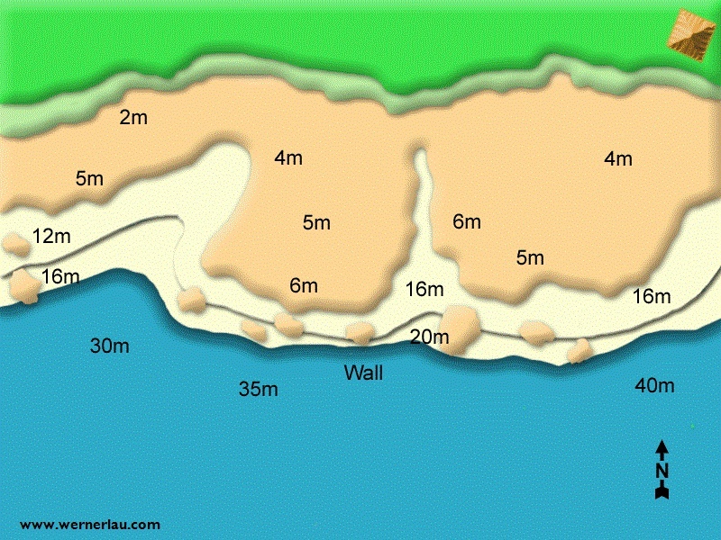 Linker Hand startet der Tauchgang direkt mit den Höhlen. Dies ist landschaftlich eine wunderschöne spektakuläre Steilwand, die Ein- und Ausbuchten, mit weit in das Riff hinein reichenden Löchern und kleinen Höhlen aufweist. Die Wand geht an dieser Seite der Insel sehr tief hinunter. Mantas und Wahlhaie werden hier häufig während der Regenzeit gesichtet. Große Barrakudas, Schnapper und Zackenbarsche suchen Schutz in der Vielzahl der Höhlen und Überhänge. Mit der Sonne im Hintergrund wirkt die Wand wie eine große Kathedrale.